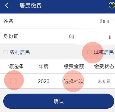 步骤三:但是在正常缴费的界面中,用户们也是可以根据自己的户口所在地进行变更的,根据自己的户口是在农村还是城镇进行勾选,然后填写自己的身份证名称以及编号,查看自己之前进行缴纳的保险金额以及开始的日期,要是没有错误的话,局可以点击确认。