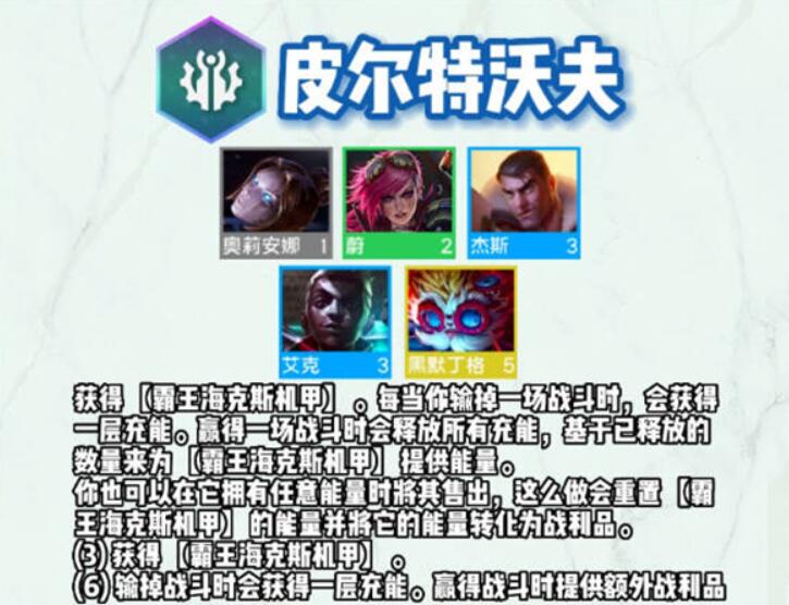 获得霸王海克斯机甲。每当你输招一场战斗时,会获得一层充能o赢得一场战斗时会释放所有充能,基于已释放的数量来为霸王海克斯机甲提供能量o你也可以在它拥有任意能量时将其售出,这么做会重置霸王海克斯机甲的能量并游它的能量转化为战利品。