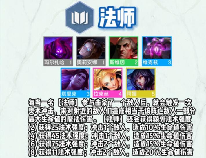 2个角色时获得20法术强度,冲击1个敌人,造成10%生命值伤害。