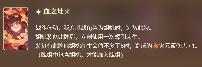装备有此牌的胡桃在生命值不多于6时,造成的火元素伤害+1。