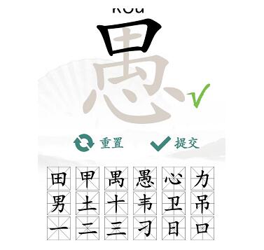 2、首先可以先将“愚”拆开看是哪些字组成,可以找到(田、甲、禺、愚、心、力)。