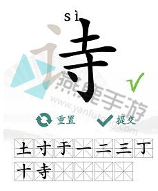 根据所给字“诗”从中找出13个常见字(土、寸、于、一、二、三、丁、十、寺、计、订、诗、讨)
