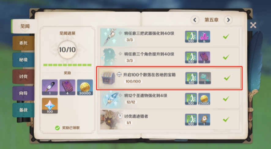 2、冒险手册-见闻第五章-开启100个宝箱。获得第二把钥匙。