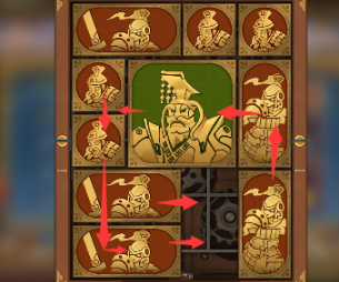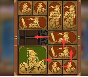 5、左上角的正方形向右移动,其下方的长方形向上左边的正方形也向上,将军旁边的正方形向左,将军向左右下角的长方形向上其旁边的长方形向右。