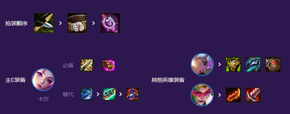 主c卡莎必备斯塔缇克电刃、珠光护手,第三件巨人杀手、朔极之矛、灭世者之帽都可以用,薇恩作为副c尽量给个鬼索的狂暴之刃再加上剩下的多余物理装,锐雯就是常规的肉装去当前排。