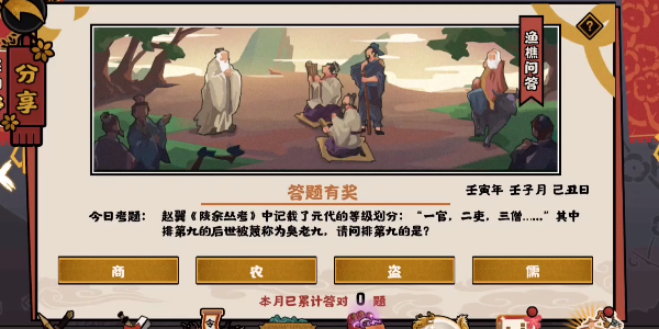 无悔华夏渔樵问答活动12.2的问题是:赵翼《陔余丛考》中记载了元代的等级划分:“一官,二吏,三僧.....”其中排第九的后世被葭称为臭老九,请问排第九的是?那么下面就跟小编一起来了解一下正确答案吧。