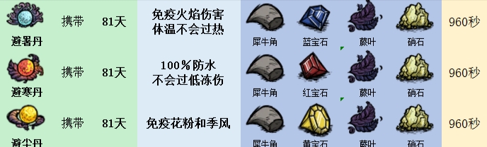 配方:1犀牛角,1黄宝石,1蕨叶,1硝石,需炼丹炉,冶炼时间 960秒,耐久81天,耐久没了不会消失,可以放进炼丹炉中并加入除了犀牛角的另外三种材料重炼,可以恢复50%耐久。