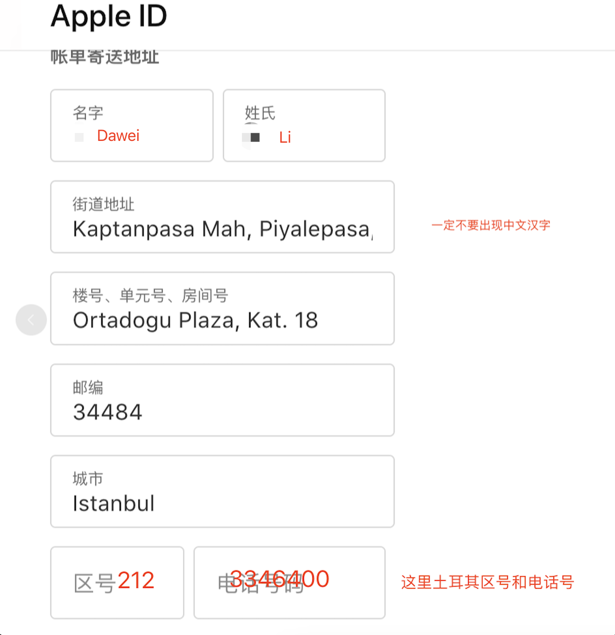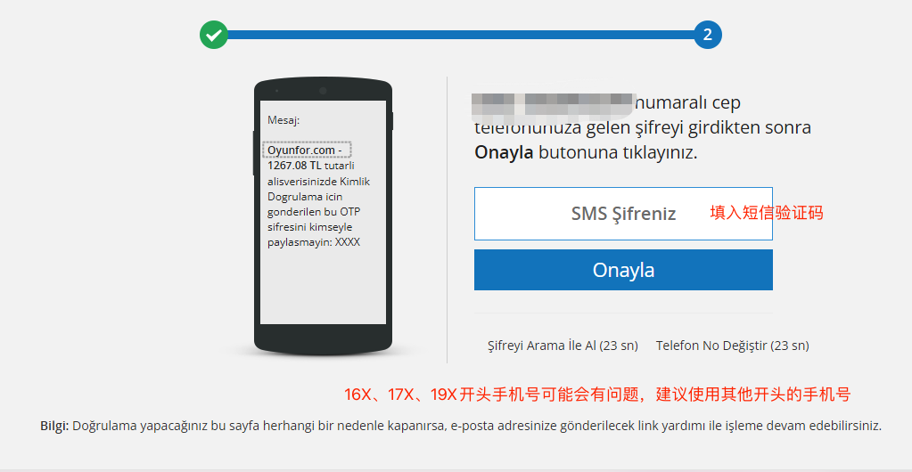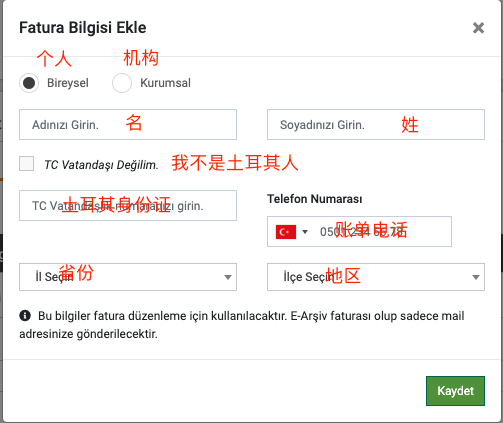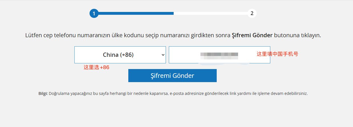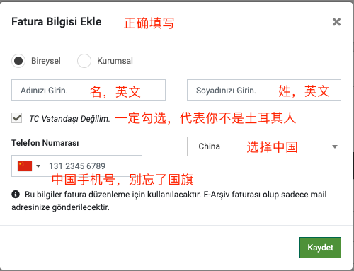 一定注意勾选我不是土耳其人,手机号码前别忘了中国国旗,填成如下图