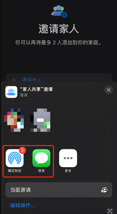 流程:【设置】》【个人头像名称】》【家人共享】》【添加账号】》【邀请他人】》【隔空投送】
