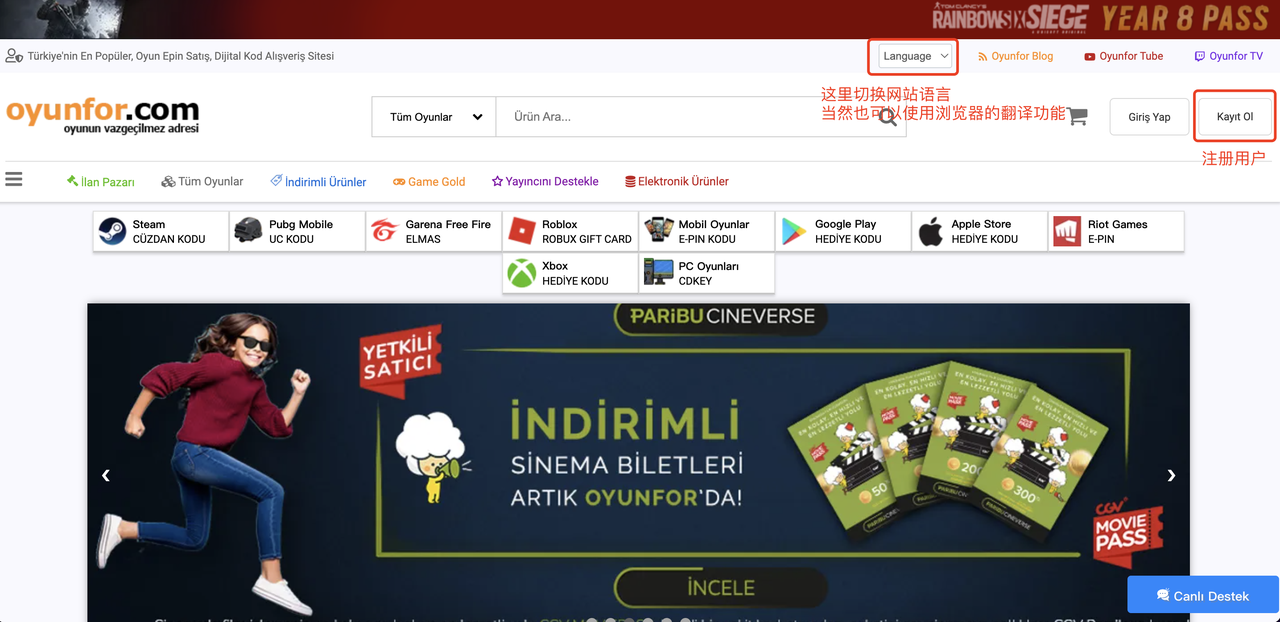 1、进入网站,你会看见网站上面都是土耳其语,你可以选择【语言】调整为其他语言(支持中文),然后点击【注册】按钮如下图