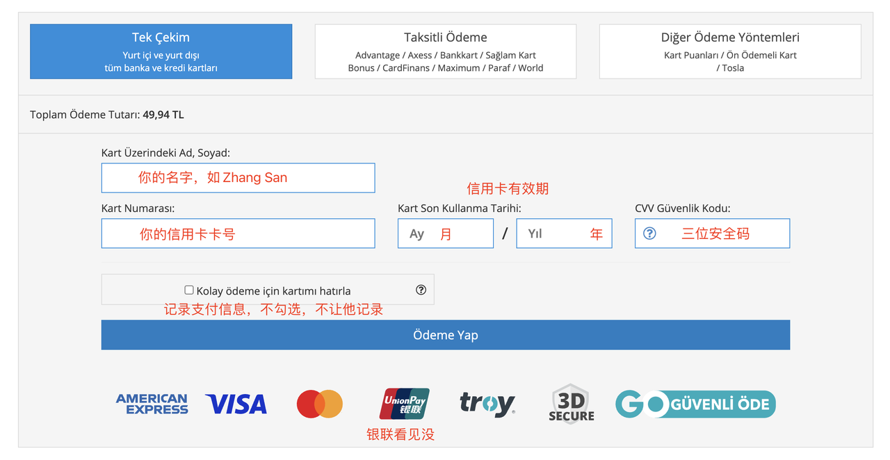 7、左边选择第一个信用卡,右边选择第二个PAYTR(如果你有VISA/MASTER卡片,且很想要顺畅的购物体验,你也可以点击右边第一个iyzico。速度快,稳定,但手续费略微高一点点)选好渠道后,点击开始支付