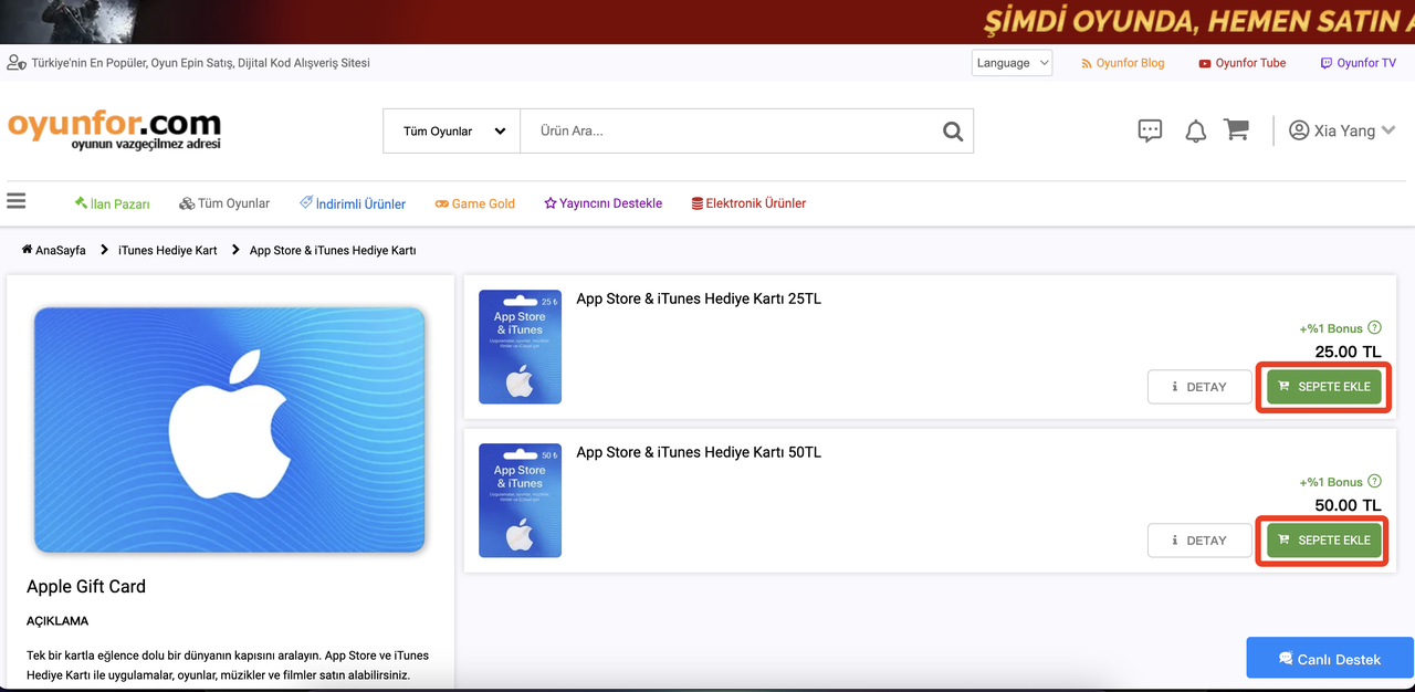 4、oyunfor网站的苹果礼品卡有两种面值,分别是25里拉和50里拉,根据所需,点击购物车按钮,进行购买