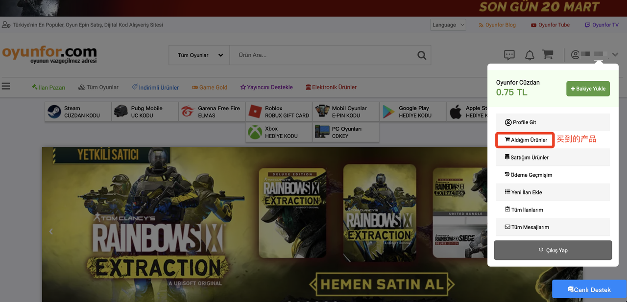 进入oyunfor网站,鼠标移到右上角的头像那里,选择第二个选项,进入我买到的产品页面