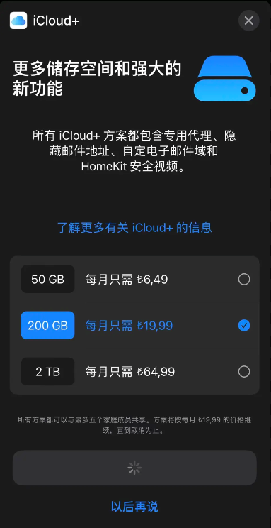 选择你想要的iCloud的空间方案,进行付款即可(会自动使用礼品卡付款)