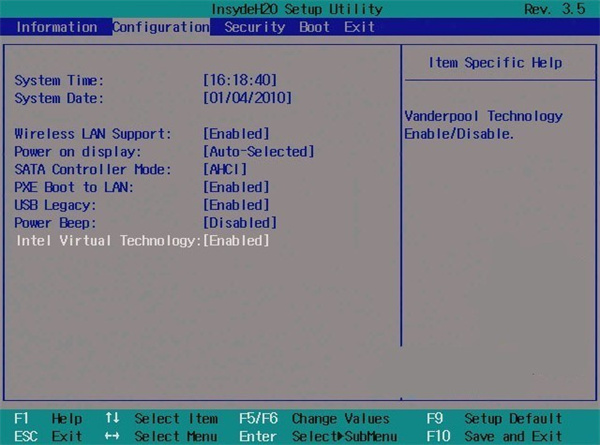 1. 使用←、→方向键选择Configuration选项,随后通过↑、↓方向键选择Intel Virtual Technology并按下回车键。