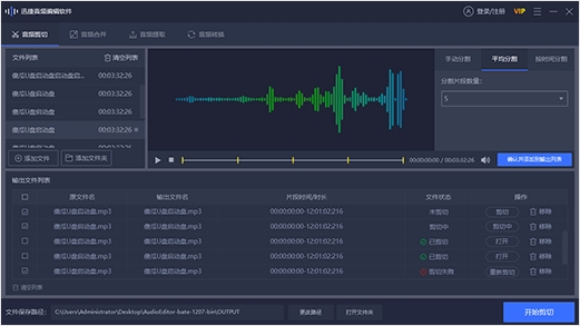 提供了非常便捷的音频剪切功能,包括了平均分割、时间分割、手动分割等,我们可以对音频进行合理的剪切,选择自己需要的音频片段。